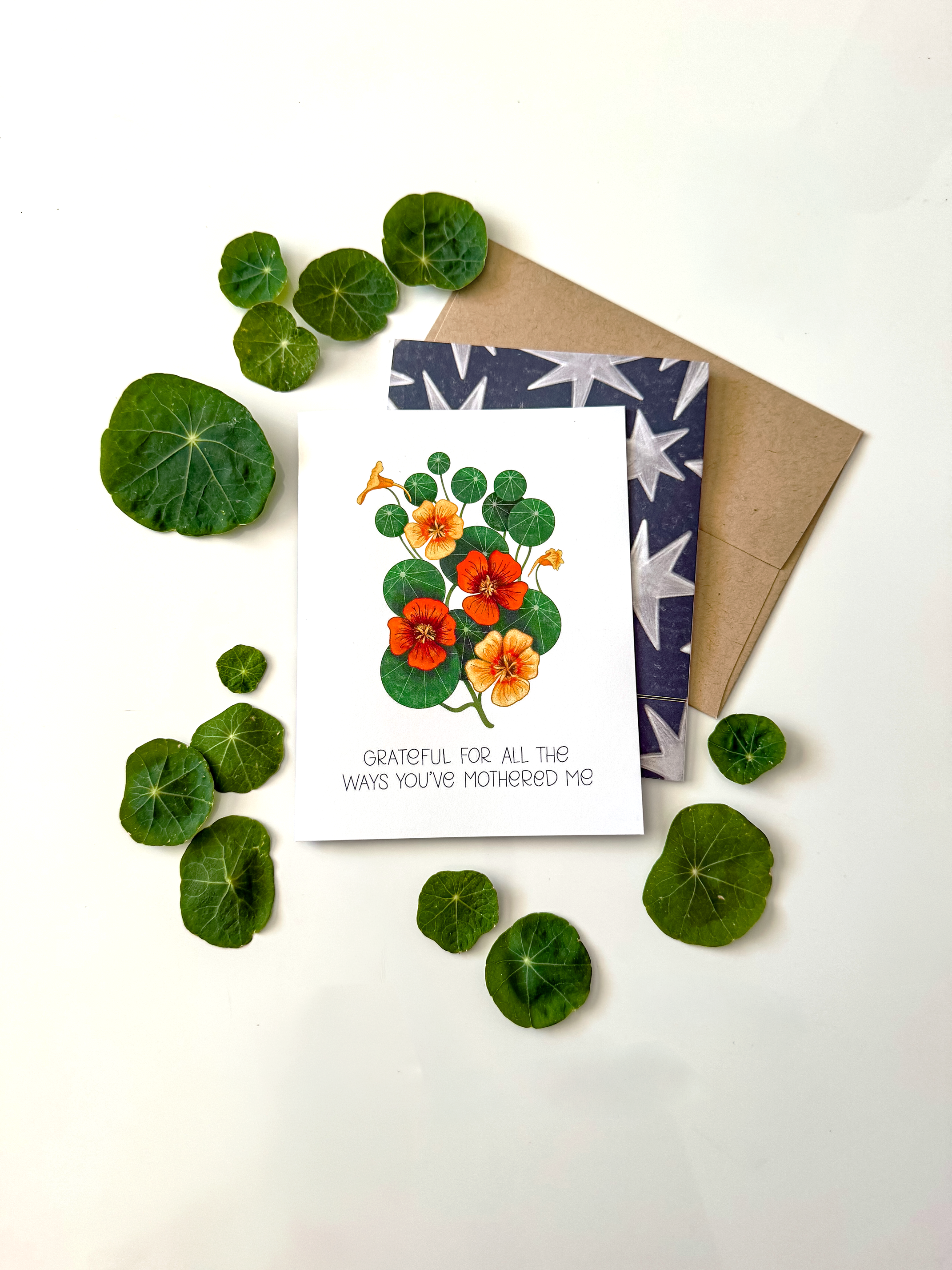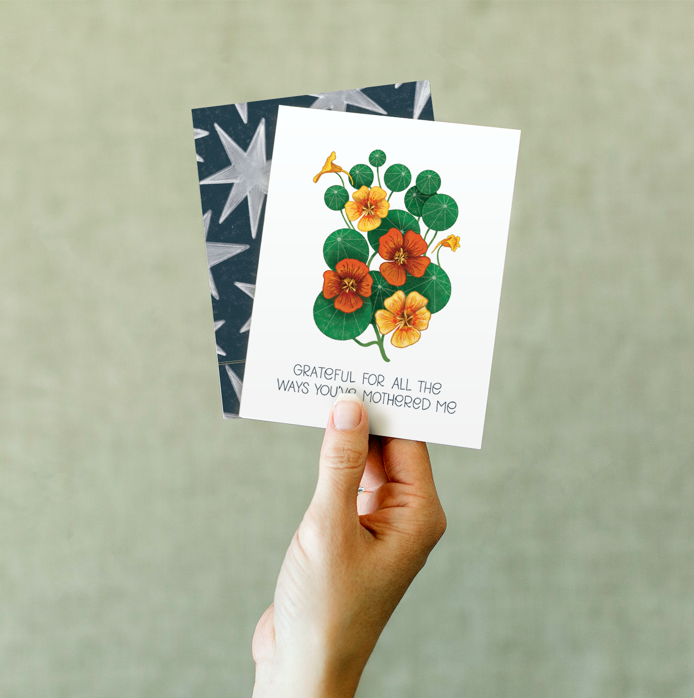 This thoughtful card honors the many forms care, love, and guidance can take. Featuring a warm nasturtium illustration, it’s designed for thanking a chosen mom, bonus mom, mentor, aunt, grandmother, or anyone who has shown up with mothering energy along the way. Perfect for Mother’s Day or any moment that calls for heartfelt gratitude beyond traditional labels.