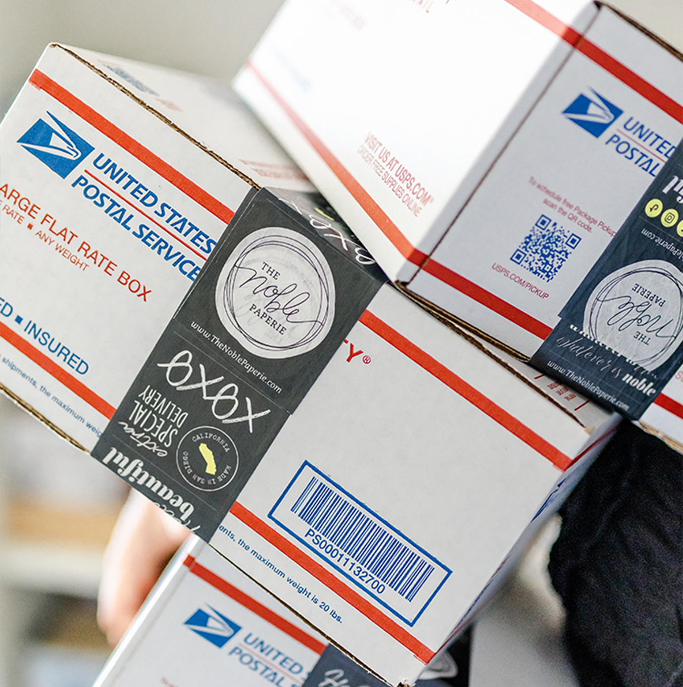 Shipping costs are charged at order fulfillment and will be included in the final invoice. The Noble Paperie ships worldwide via USPS and UPS. The Noble Paperie is not responsible for carrier delays. Local orders also have the option of hand-delivery. -